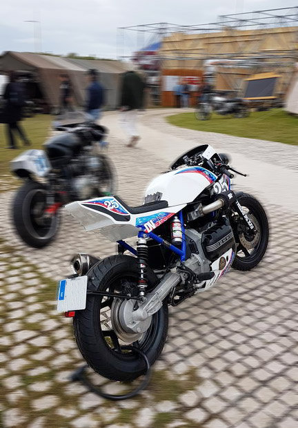 Flying Brick (K100) die Zweite – diesmal in der Leistungsvariante mit Lachgaseinspritzung, offenem Luftfilter und einem Doppelscheinwerfer, der zusammen mit der Verkleidung ein wenig käferartig wirkt. Die Batterie musste natürlich aus dem Rahmendreieck weichen und diverse Motorverkleidungen sind offenbar ebenfalls davongeflogen.