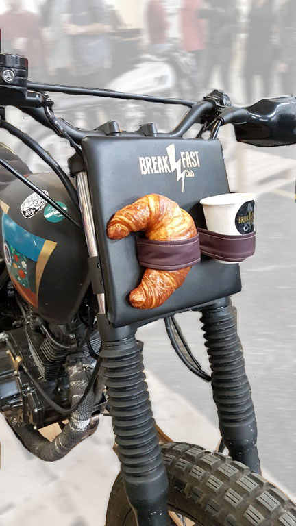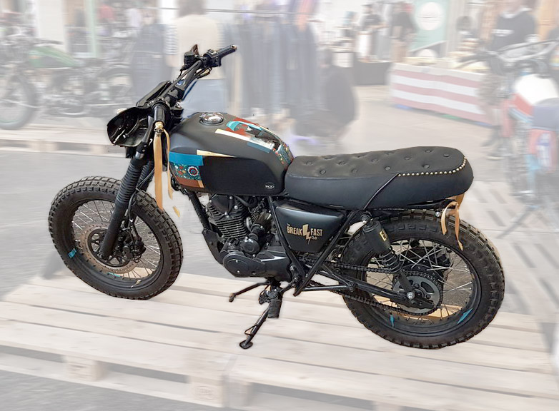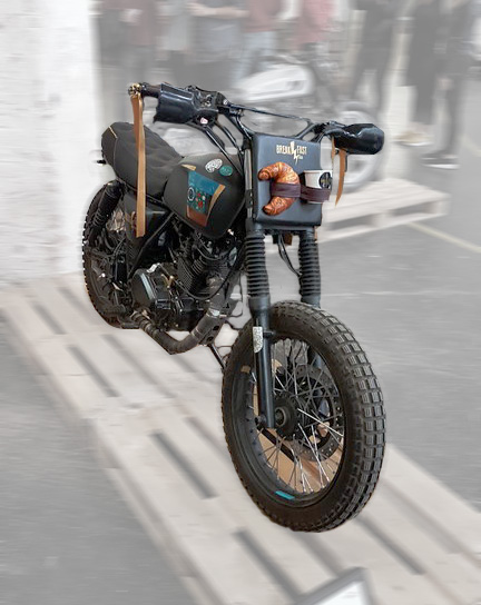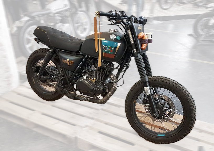 „Schnell zum Frühstück“ signalisiert hier eine Brixton BX 125, die in der Früh den Auspuff und die Lampen vergessen haben dürfte – frühinvalide sozusagen. Aufwachen muss man ja sowieso und jetzt wird es morgens ja eh schon wieder hell. Wer mehr dazu wissen möchte – die Damen des BreakFastClubs können da Auskunft geben.