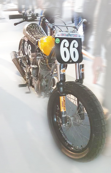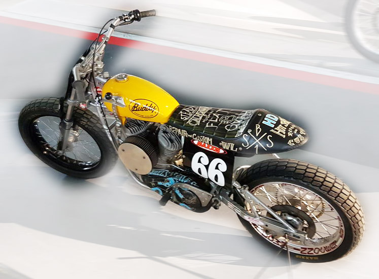 Harley Flathead (1929-1951) Japan-Umbau als Flat Tracker – das Original hatte mit dem schnellen Oval dank Starrahmen, Springergabel usw. wohl eher wenig zu tun. Die Japaner von Buddy Custom Cycles sehen das anders und stellen diesen Motor mit offenem Filter in einen neuen Rahmen. Mit neuer Gabel, Schwinge mit seitlich-direkter Dämpfung und der, bei Flattrack-Rennen sicher extrem hilfreichen, suicide-shift (Schaltung links neben dem Tank)!
