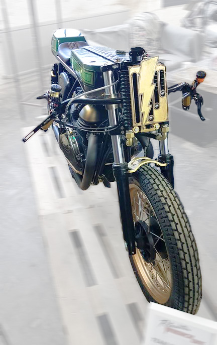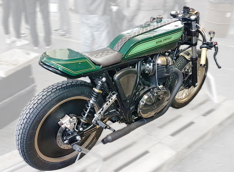 Ein sehr slicker Umbau von den Petrolettes – eine Enfield 650 Basis, mit einem Tank aus dem biblischen Jahr 1926, dazu ein etwas eigenwillig montierter Lenker mit Magura Bremsen und hinten neue YSS Federbeine – netterweise ohne den ansonsten störenden Ausgleichsbehälter.